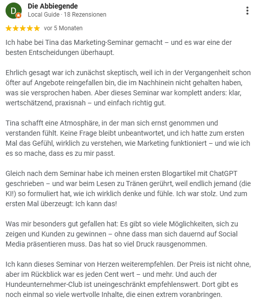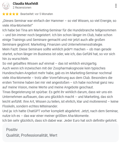 Ich bin Tina und begleite seit 2012 selbständig arbeitende Menschen aus der Hundebranche dabei, sich ein Unternehmen aufzubauen, das richtig gut funktioniert.