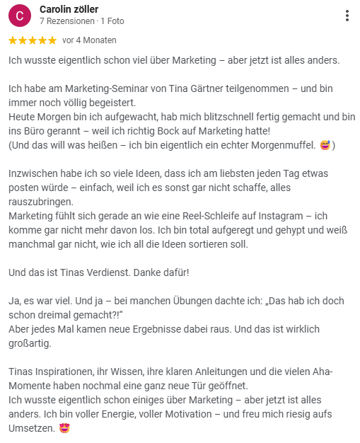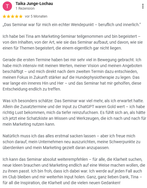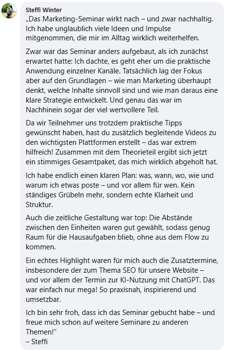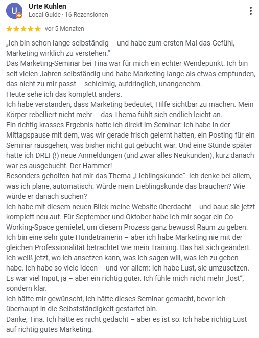 Und genau deshalb entwickeln wir in diesem Seminar einen Marketing-Ansatz, der zu Dir passt – der sich echt anfühlt und funktioniert.