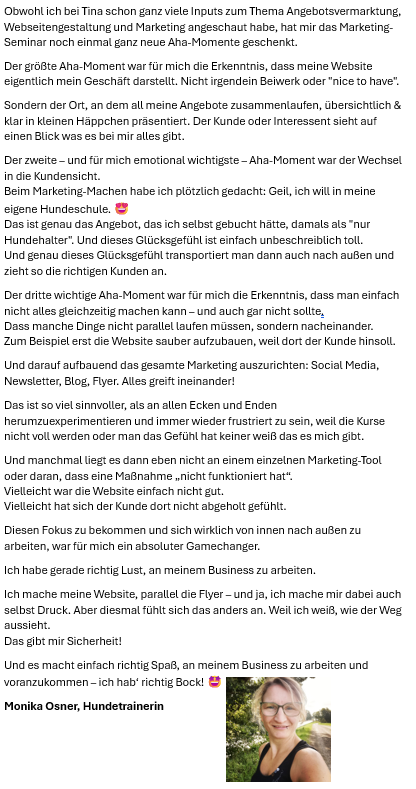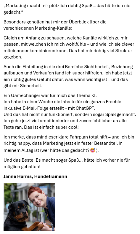 Du präsentierst Dich klarer und stehst souveräner hinter Deinem Angebot. Nicht, weil Du plötzlich „mehr Marketing machst“, sondern weil Du weißt, wie Du Deine Stärken und das, was Du bewirkst, zeigen kannst.