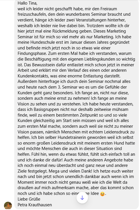 Dieses Wissen habe ich dann in die Hundebranche übersetzt – als erste Unternehmensberaterin Deutschlands speziell für diese Zielgruppe. Inzwischen habe ich über tausend HundeunternehmerInnen begleitet.